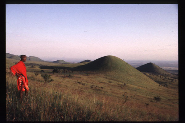 A magical land of black-frozen lava flows studded with blazing red-hot poker trees; of shoals of extinct volcanoes wreathed in dense forests and hung with Spanish moss, the Chyulu Hills coil like a sleeping dragon on the lion-gold plains of his treasure. To the west the pink-haloed peak of Mount Kilimanjaro rises like a Hollywood backdrop and all around stretch the mirage miles of Maasai land, dusty, dry and stalked by scarlet herders and dust-plumed cattle.