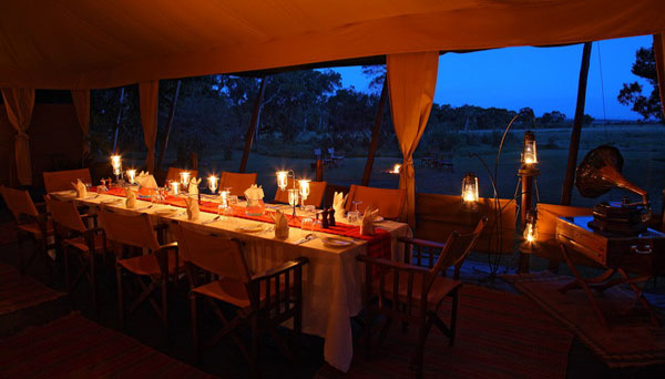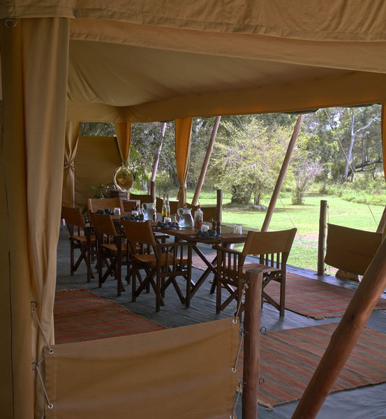 There is a luxurious central mess tent adjacent to the lounge tent. Meals are served either in the mess tent, or within the surrounding grounds, or in the bush. Sundowners are served nightly around the campfire.