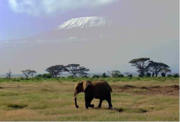 Towered over by the magnificent bulk of 5,896 m high Mount Kilimanjaro, Africa's highest mountain, Am |