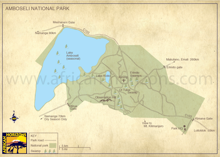 Map of Amboseli National Park in Kenya; East African safari and travel destination
